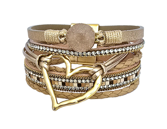 Bracelet bohème jonc en cuir, cristaux, alliage de fer, résine et breloque coeur